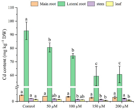 The tea seedling Cd accumulation trend can be described as follows: lateral roots > main roots > stems > leaves (Figure 4). Under Cd stress, the plants without melatonin application exhibited a maximum Cd amount in all parts of the tea seedlings. The Cd content in the main roots was 4.56 mg kg−1 DW, in lateral roots 92.88 mg kg−1 DW, in stems 2.22 mg kg−1 DW, and in leaves 1.50 mg kg−1 DW. However, the treatment with different melatonin levels resulted in a maximum Cd concentration decline of up to 39, 36, 32, and 52%, respectively, in the main roots, lateral roots, stems, and leaves. Therefore, based on the Cd content of all the treatments, the 150 μM melatonin group considerably reduced the tea seedlings’ Cd absorption.