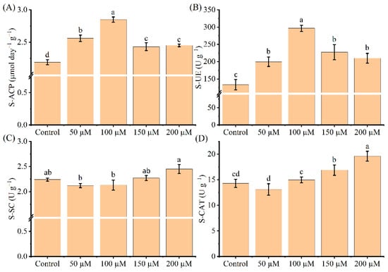 Effects of exogenous melatonin application on soil enzyme activities of Cd-stressed tea seedlings, including S-ACP (A), S-UE (B), S-SC (C), and S-CAT(D). The data represent means ± standard deviations for three replicates. Different letters indicate groups that are significantly different at p < 0.05.
