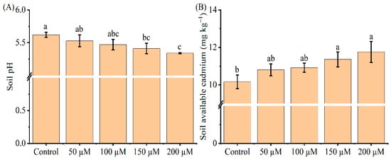 Effect of exogenous melatonin application on the soil pH (A) and available Cd (B) content. The data represent means ± standard deviations for three replicates. Different letters indicate groups that are significantly different at p < 0.05.