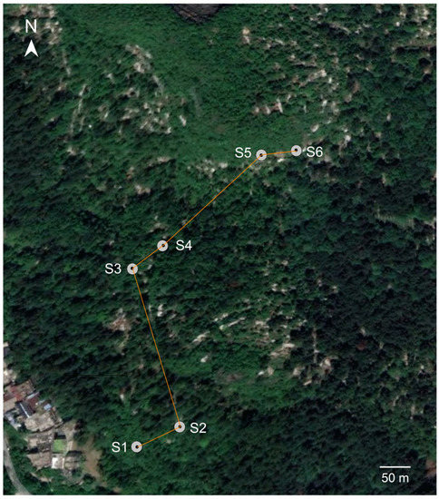 Six plots were established along three altitudes: S1 and S2 on the lower altitude, S3 and S4 on the medium altitude, and S5 and S6 on the higher altitude (Figure 1). Each plot had an area of 20 × 20 m2 and 60–80 m away from the neighboring plot at each altitude. Common species in each plot were recorded in Table 1. Collectively, four tree species (Ligustrum lucidum ait., Broussonetia papyrifera L., Platycarya longipes Wu., and Zelkova serrata (Thunb.) Makino) and five shrub species (Viburnum dilatatum Thunb., Ampelopsis delavayana Planch., Rosa cymosa Tratt., Zanthoxylum armatum DC., and Rubus biflorus Buch.-Ham. ex Smith) were selected for the subsequent measurement and sampling. Species in each plot included four replicates (individuals).