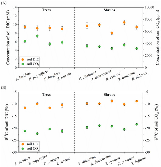 An assessment of fDIC_soil between two plant life forms, namely trees and shrubs, showed no clear trend (Figure 4), indicating that the variation of fDIC_soil was mainly resulted from the interspecies differences. In most species, the values of fDIC_soil were comparable with those reported in the laboratory experiments [24,25,26], suggesting that soil DIC was easily accessible to plants in the karst habitats. In this study, nine species were all native, most of which were deciduous trees or shrubs. Although species differed in height, biomass, ages, etc., our measurements and sampling were all conducted with newly expanded leaves and within the root zones of the same soil layer. As leaves and roots control the uptake of atmospheric CO2 and soil DIC, respectively, the species-specific variation in fDIC_soil might be related to leaf gas-exchange traits (Table 2) and soil conditions (Figure 2).