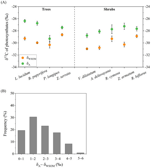 δ13C of photosynthates determined by measuring isotope signals of leaf WSOM (orange closed circle) or predicted with Equation (1) that only accounted for assimilation of atmospheric CO2 (green closed circle) of nine species across three altitudes (A); frequency distribution of the discrepancy between δA and δWSOM (B).