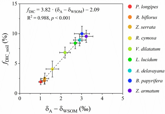 Relationship between (δA-δWSOM) and fDIC_soil among nine species across three altitudes. N = 4 for each species in the specific plot.