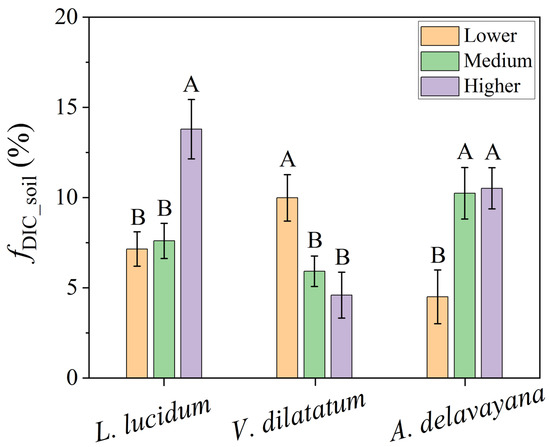 fDIC_soil of one tree species (L. lucidum) and two shrub species (V. dilatatum and A. delavayana) at different altitudes. N = 4 for each species in the specific plot. Capital letters on the error bar indicate significant differences (p < 0.05) among altitudes.
