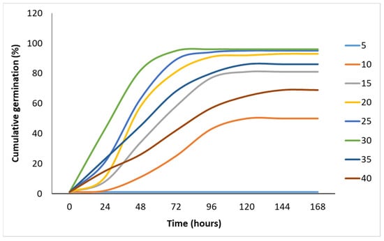 Germination was significantly affected by temperature. The seeds germinated more rapidly at 30 °C than at any other temperature treatments during the first 72 h and then reached a germination peak (Figure 1). Seed germination was slower at 10 °C compared to the other temperatures. The GP of the seeds reached 95% at 30 °C after 72 h, while it only reached 50% at 10 °C after 120 h. At temperatures lower and higher than 30 °C, seed germination was slower, and the slope declined (Figure 1).