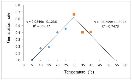 Light had a significant effect on the GP. GPs were 25.71 and 87.67% in the light and dark conditions, respectively (Table 1). GR was significantly influenced by temperature. It was increased by enhancing temperatures from 5 to 30 °C and then suddenly dropped at higher temperatures. It was low at temperatures lower and higher than 30 °C. GRs were 0.17, 0.66, and 0.40 seeds per day at 10, 30, and 40 °C, respectively (Figure 2). There were positive and negative slopes in the ranges of 5–30 °C and 30–40 °C, respectively (Figure 2). The intersection of the linear regression fit between the mentioned ranges of temperatures, with the horizontal axis showing that the base and maximum temperatures were 5 and 53.75 °C, respectively (Figure 2). The intersection below and above the regression lines displayed an optimal temperature of 30 °C (Figure 2).