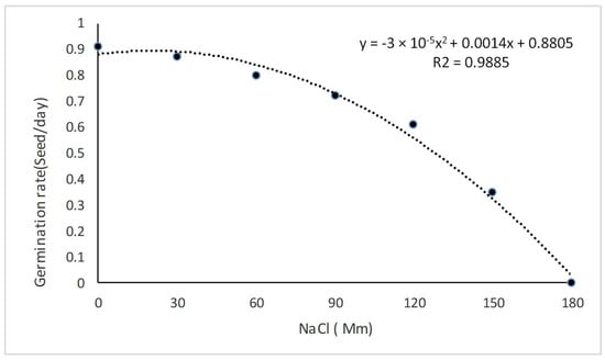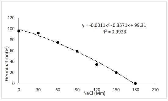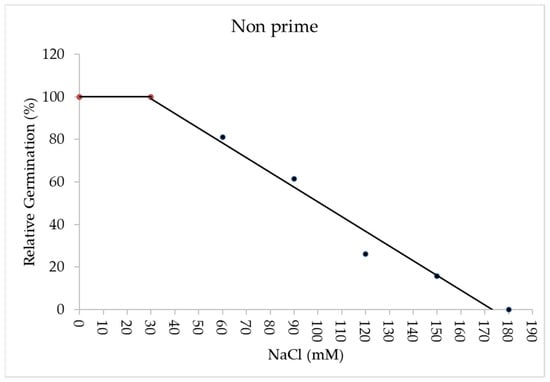 Even halophyte plants are sensitive to salinity at the germination stage [36]. Their GPs decrease with increasing salinity, thus resulting in a delay in seed establishment. Therefore, it is significant to determine the salinity tolerance threshold for plants during the germination stage. Salinity tolerance of crops is estimated by comparing relative yields at different soil salinity levels. The graph response of a crop plant to salinity is linear and consists of two parts: (i) a line that specifies the range of the salinity tolerance threshold with a slope of zero and (ii) a line concentration dependent, whose slope depicts the rate of decrease in yield per unit increase in salinity. According to the above definition, the relative yield of a crop at a certain salinity level is obtained via the following equation [37]: