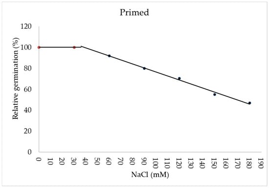 The salt tolerance threshold is a critical parameter for establishing plant salt tolerance, which is generally known as the relative yield response to increasing salinity. In this study, the results showed a negative trend between salinity and germination traits (Table 3). The germination processes of H. sabdariffa tolerated a salinity of up to 30 mM of NaCl (Table 2, Figure 5). Higher concentrations led to a collapse of the germination processes. Therefore, the 30 mM salinity of NaCl was considered the salinity tolerance threshold of H. sabdariffa. The salinity tolerance threshold of the seedlings was also influenced by the priming of the seed. Priming with NaCl (18 mM for 24 h) increased the tolerance threshold for salinity in the germination phase. The germination tolerance threshold increased from 30.23 ds/mM (in non-primed seeds) to 30.97 mM NaCl ds/m2 in primed seeds (Figure 5 and Figure 6). The results showed that priming with NaCl (18 mM for 24 h) increased the salinity tolerance threshold in the H. subdariffa germination phase. Furthermore, the slope of germination decreasing with increasing salinity was affected by priming, so that with increasing salinity, the slope of germination reduction after the tolerance threshold at the salinity point was lower in the primed seeds than in the non-primed seeds (Figure 5 and Figure 6). Priming the stem strengthened the salinity tolerance threshold and the salinity tolerance level after this point in the germination phase.