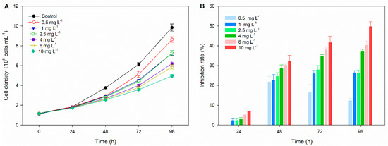 The effects of TC on the growth of C. pyrenoidosa and its inhibition rates are presented in Figure 1. No significant growth inhibition is observed in microalgae exposed to TC after 24 h of exposure, but microalgal growth is significantly inhibited by TC in an obvious dose–response manner with prolonged exposure time (48–96 h). The inhibition rates of low concentrations of TC (0.5–2.5 mg L−1) begin to decline after reaching the peak at 48 h or 72 h. This phenomenon may be due to the high detoxification ability of microalgae to low concentrations of TC and the continuous removal of TC by microalgae. However, the inhibition rates of high concentrations of TC (4–10 mg L−1) increase with increasing exposure time. At the end of exposure period (96 h), the inhibition rates of TC at concentrations of 0.5, 1, 2.5, 4, 6, and 10 mg L−1 are 12.28%, 26.3%, 26.2%, 37%, 40.32%, and 49.68%, respectively. An earlier study reports the 96 h EC50 of TC on C. vulgaris to be 7.73 mg L−1 [29]. In another work, Yang et al. (2013) report the maximum inhibition rate of TC on M. aeruginosa (0.05–1 mg L−1) and S. capricornutum (0.2–5 mg L−1) to be 35% and 70%, respectively [30]. These results show that C. pyrenoidosa possesses a higher tolerance to TC exposure than other algal species, suggesting its potential application in the bioremediation of TC-polluted water.