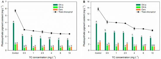 Effects of TC on the Chl-a, Chl-b, Cars, and total chlorophyll of C. pyrenoidosa after 48 (A) and 96 h (B) of exposure in different treatments. The different letters indicate significant differences (p < 0.05) between the control and experimental treatments.