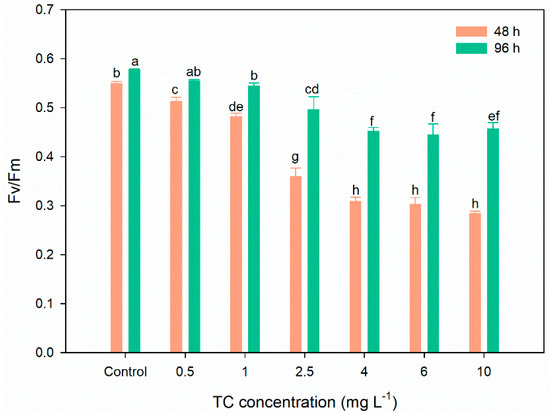 Effects of TC on the Fv/Fm of C. pyrenoidosa after 48 and 96 h of exposure in different treatments. The different letters indicate significant differences (p < 0.05) between the control and experimental treatments.