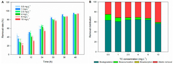Time course profiles of TC removal rates by C. pyrenoidosa (A) and mass balance of TC in terms of biodegradation, bioaccumulation, bioadsorption, and abiotic processes after 48 h of exposure (B).