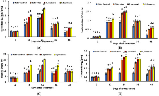Effect of Brevibacillus parabrevis and Pseudomonas fluorescens on (A) peroxidase activity (U/min/g FW), (B) polyphenol oxidase activity (U/min/g FW), (C) phenol content (phenols (mg/g FW)), and (D) flavonoids (mg/g FW) in leaf extracts of cumin plants after inoculated with Fusarium oxysporum. Values in the column followed by different letters were significantly different among treatments according to a least significant difference test (p = 0.05).