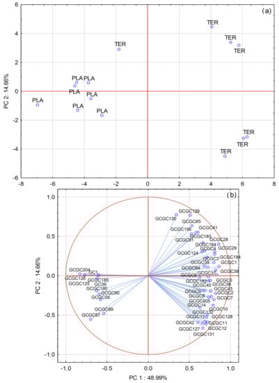 (a) Separation of Plavac mali and Teran monovarietal red wines based on variety along principal components PC1 and PC2; (b) factor loadings of selected volatile aroma compounds, as determined by gas chromatography−mass spectrometry (GC−MS) and two-dimensional gas chromatography with time−of−flight mass spectrometry (GC×GC−TOF−MS) analysis, on PC1 and PC2. Numbers indicating compounds correspond to those in Table 2 (GC, i.e., GC−MS) or in Table 3 (GCGC, i.e., GC×GC−TOF−MS).