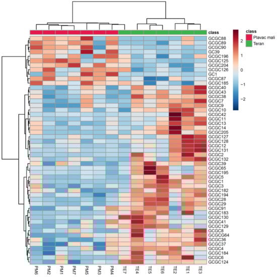 Hierarchical cluster analysis (HCA) is an unsupervised multivariate statistical method in which cases (e.g., wines) are considered as lying in a multidimensional space in which the number of dimensions equals the number of variables (e.g., volatile compounds). Distances between cases are calculated, and cases are grouped into categories based on similar characteristics defined by the variables’ values. HCA was performed on the original dataset (14 cases × 51 variables). Clear clustering of the wines according to variety was obtained, which is shown on a heatmap diagram in Figure 2. The monovarietal wines were related to the volatile compounds previously found as characteristic for a particular variety by ANOVA (Table 2 and Table 3) and PCA (Figure 1). The generated heatmap probably offered the clearest insight into the intra-varietal heterogeneity of the investigated wines, especially considering that the selected compounds were those for which statistical differences were found. Again, a single Teran wine sample was found similar to the Plavac mali cluster.