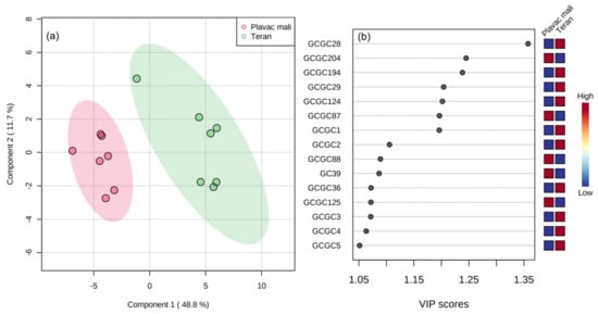 (a) Differentiation of Plavac mali and Teran monovarietal red wines according to variety in two-dimensional space by partial least squares−discriminant analysis (PLS−DA); (b) variable importance in projection (VIP) scores of the variables (volatile compounds) most useful for the differentiation.