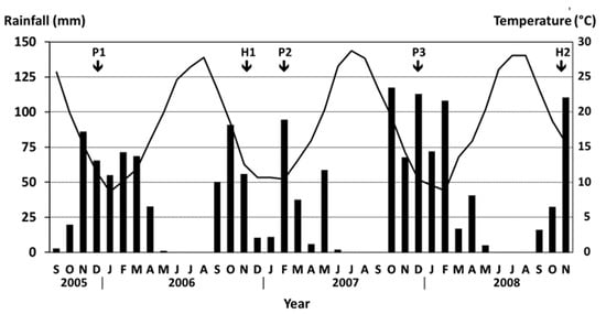 Cover crop, hand-sowing, irrigation and pruning methods remained the same throughout the 3-year experimental period. In the cropping seasons 2005/2006 and 2007/2008, fertilisation and sowing were performed at the beginning of December while in the non-cropping season (2006/2007) they were performed at the end of January due to dry conditions in December 2006 and January 2007 (Figure 3). Seed rates and fertility inputs are shown in Table 1.