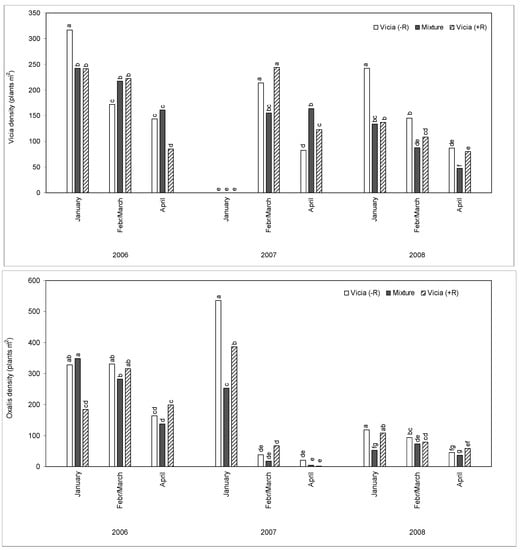 When the three vetch-based cover crop treatments were compared, vetch density in cover crops established from untreated V. sativa seeds was significantly higher when (i) compared with both other vetch-based cover crops in January 2006 and 2008, and February 2008 and (ii) compared with the cover crop establish from the seed mixture in February/March 2007 and April 2008 (Figure 3; Supplementary Figure S1). In contrast, vetch density in cover crops established from untreated V. sativa seeds was significantly lower compared with the two other vetch-based cover crop treatments in February/March 2006, April 2007 (Figure 3; Supplementary Figure S1).