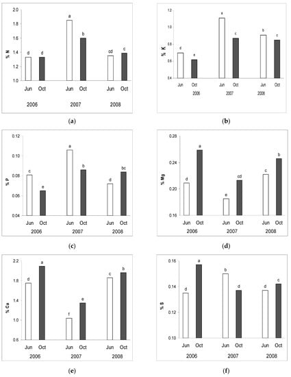 Leaf mineral nutrient concentrations were compared to estimate the relative supply of mineral nutrients to olive trees in (i) plots sown with different cover crops and (ii) different years (2006, 2007 and 2008) and on (iii) two different sampling dates in each growing season (in June after incorporation of cover crops and 4 months later in October at the end of olive fruit development) (Table 4 and Table 5).