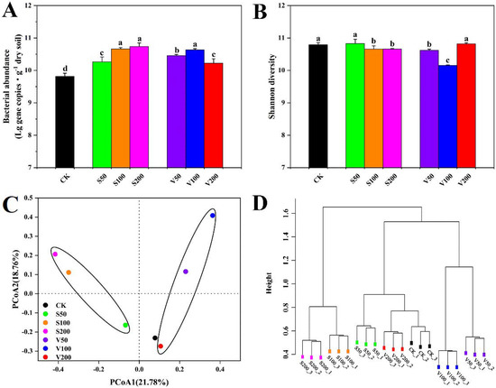 Quantitative PCR results show that the bacterial populations in sewage sludge and sludge-based vermicompost treatments were significantly (p < 0.05) higher than that in CK (Figure 1A), with the highest abundance observed in the S200 treatment. Organic ameliorants exhibited significant (p < 0.05) influence on the compositional diversity of bacterial communities in coastal mudflat salt-affected soil (Figure 1B and Table S2). In particular, the Shannon diversities of bacterial communities in most organic ameliorant-amended soils declined with significantly lower measurements observed in the S100, S200, V50, and V100 treatments as compared to that in CK.