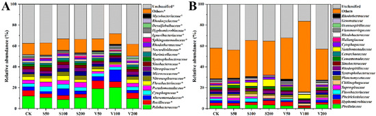 PCoA shows that sewage sludge and sludge-based vermicompost significantly (p < 0.05) altered the bacterial structural diversities of coastal salt-affected soil (Figure 1C and Table S2). In general, both sewage-sludge- and sludge-based vermicompost-amended soils harbored distinctive bacterial community structures as compared to untreated soil. Furthermore, different application amounts of the two organic amendments exhibited obvious dose effects on soil bacterial community distributions in the biplot. Hierarchical cluster analysis further reveals that coastal mudflat soils amended by higher amounts of sewage sludge (S100 and S200) and vermicompost (V100 and V200) clustered together, respectively, and significantly separated from CK treatment (Figure 1D).