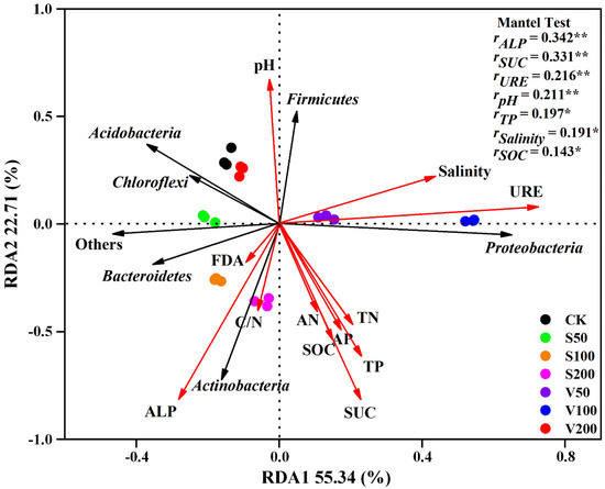 Overall, lower soil pH and salinity, and higher contents of nutrients (C, N, and P) and enzyme activities were observed in organic ameliorant treatments as compared to the CK treatment (Tables S4 and S6). Additionally, the application types, amounts, and their interactions of organic ameliorants exhibited significant (p < 0.05) effects on most soil physicochemical properties and soil enzyme activities (Tables S5 and S7). In the current study, RDA was conducted to reveal the determinant factors among physicochemical and enzymatic attributes in driving bacterial community differentiation in coastal salt-affected soil (Figure 4). Results show that the abiotic and biotic factors mentioned above explained 78.05% of the total bacterial community variation in soils under different treatments. Among these factors, soil pH, salinity, SOC and TP, and the activities of SUC, URE, and ALP were the predominant determinants with respect to the reassembly of the bacterial communities in soils after different organic ameliorants amendments.
