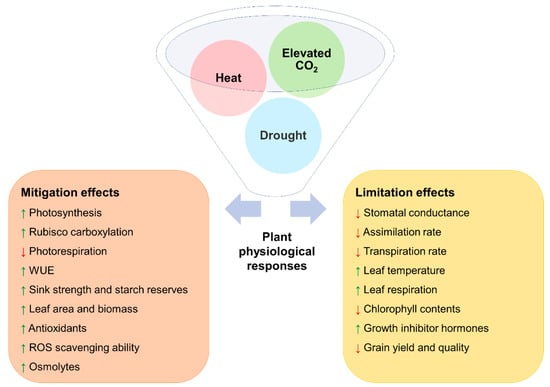 The mitigation and limitation effect under combined elevated CO2, drought, and heat stress on the main physiological and biochemical responses in plants.