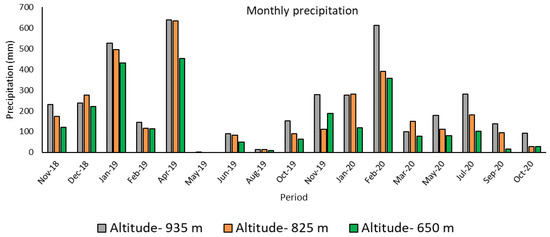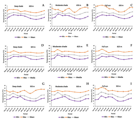 As the system was rainfed, the water availability was obtained by monitoring precipitation through pluviometers installed in the three altitudes (Figure 1). Additionally, air temperature values were monitored with Temperature External Data Logger devices (ONSET, Pro v2 Logger U23-00x, Onset Computer Corporation, MA, USA), installed in each of the three altitudes and three light conditions, collecting values every 15 min along the day. These 96 values per day were used to obtain daily means. Monthly averages in each date were then calculated using the 30 daily average values (Figure 2).