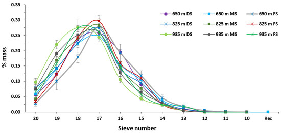 Distribution of green coffee beans according to their size, obtained under three light exposure conditions (deep shade, DS; moderate shade, MS; full Sun, FS), and three altitudes (650 m, 825 m and 935 m). Values represent the values ± SE (n = 5).