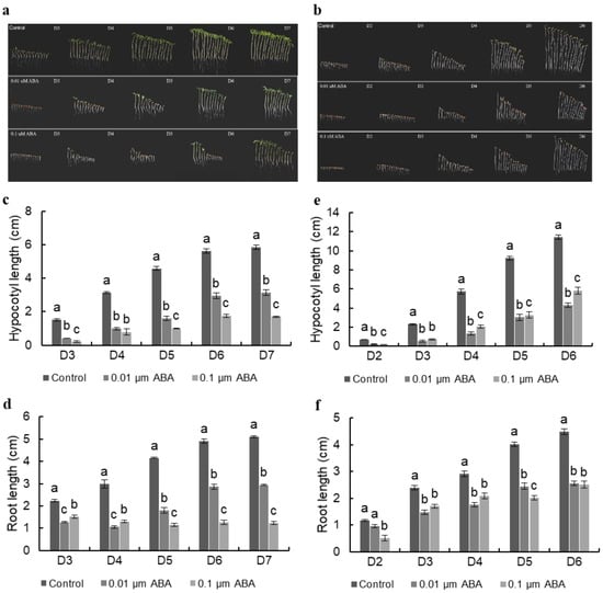ABA regulates many aspects of plant growth and development, including inhibition of hypocotyl elongation and root elongation [,,,,]. Here, we examined the effect of ABA on hypocotyl elongation as well as root elongation in tomato seedlings by time-course analysis. Tomato seedlings were grown in normal light conditions (25 °C light for 16 h and 18 °C dark for 8 h) for seven days (Figure 1a). We found that ABA inhibited hypocotyl elongation at both 0.01 µM and 0.1 µM. 0.1 µM ABA treatment had a stronger inhibitory effect compared to 0.01 µM (Figure 1c). It exhibited a similar effect of ABA-induced suppression on the root elongation (Figure 1d). Next, we checked the effect of ABA on hypocotyl elongation as well as root elongation in dark-grown tomato seedlings (Figure 1b). The results showed that ABA inhibited hypocotyl and root elongation of dark-grown seedlings at both 0.01 µM and 0.1 µM. Compared with that of light-grown seedlings, the differences of inhibition between 0.01 µM and 0.1 µM ABA treatment in the dark-grown seedlings were smaller (Figure 1e), indicating 0.01 µM ABA is sufficient to inhibit hypocotyl elongation of dark-grown seedlings. Compared with light-grown seedlings, the dark-grown seedlings were more sensitive to ABA (Figure 1c,e). By comparing the hypocotyl length of ABA-treated tomato seedlings grown in light with those grown in dark, we found that light signal was an important factor affecting hypocotyl elongation. Under dark conditions, the hypocotyls of tomato seedlings with or without ABA treatment were significantly longer than that under light conditions (Figure 1c,e). This demonstrates that dark-induced growth of hypocotyls exceeded the inhibition of hypocotyls by ABA.