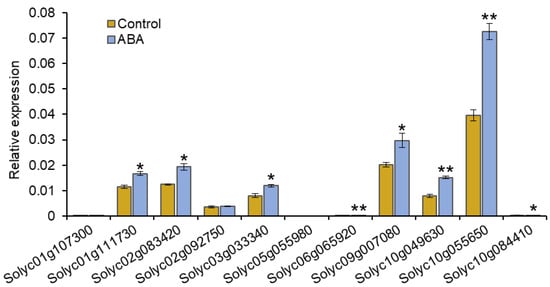 To understand the function and transcriptional regulation of SlPP2C.D genes on ABA, and to find out whether SlPP2C.D genes could potentially participate in ABA signaling pathways and ABA-mediated inhibition of hypocotyl elongation, we first checked the expression patterns of SlPP2C.Ds in response to ABA treatment. The results showed that the expression of seven SlPP2C.D members were significantly induced by ABA, including Solyc01g111730, Solyc02g083420, Solyc02g083420, Solyc06g065920, Solyc09g007080, Solyc10g049630, and Solyc10g055650. In contrast, Solyc10g084410 was expressed at low levels and downregulated by ABA. No significant difference was observed for Solyc01g107300 and Solyc02g092750. Solyc05g055980 was undetectable both in mock-treated and ABA-treated seedlings (Figure 2). These results indicated that about half of SlPP2C.Ds could be responsive to and induced by ABA and might play a role in ABA signaling.