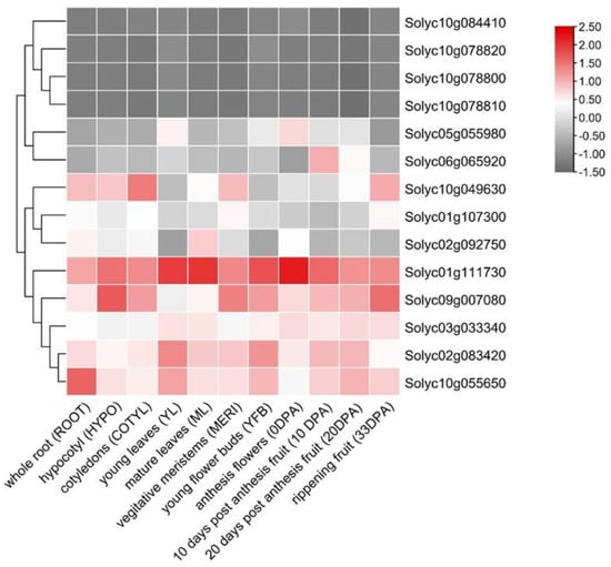 The organ-specific patterns of SlPP2C.D genes were analyzed by using RNA-seq data from Tomato Functional Genomics Database (http://ted.bti.cornell.edu/cgi-bin/TFGD/digital/home.cgi (accessed on 7 August 2022)). Transcriptome data of eleven tissues of wild species S. pimpinellifolium (LA1589) were downloaded. Eleven different tissues include newly developed leaves around 5 mm long, mature green leaflets, flower buds 10 days before anthesis or younger, flowers at anthesis, fruit 10 days post anthesis (10 DPA), fruit 20 days post anthesis (20 DPA), and fruit 33 days post anthesis (33 DPA). RPKM (reads per kilobase million) values are an average of 4 replicates. RPKM values of SlPP2C.D genes were log2-transformed, and heat maps of SlPP2C.D genes in different tissues were generated using TBtools v1.098745 software [].