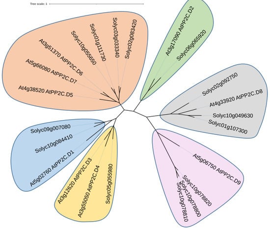 Accession numbers of SlPP2C.D genes were derived from a previously published study []. Protein sequence of each SlPP2C.D gene was downloaded from Sol Genomics Network (https://solgenomics.net/ (accessed on 26 May 2022)), and conserved domains were annotated via Conserved Domain Search Service (https://www.ncbi.nlm.nih.gov/Structure/cdd/wrpsb.cgi (accessed on 26 May 2022)).