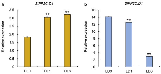 Light-responsive expression patterns of SlPP2C.D1 in hypocotyls of tomato seedlings. (a) Seven-day-old, dark-grown seedlings were exposed to white light for 0 h (DL0), 1 h (DL1), or 6 h (DL6). (b) Seven-day-old, light-grown seedlings were exposed to darkness for 0 h (LD0), 1 h (LD1), or 6 h (LD6). For (a,b), hypocotyls were dissected for RNA analysis by RT-qPCR. The tomato ACTIN2 gene was used as an internal standard. Values are means ± SD of three biological replicates. Asterisks refer to data significantly different from DL0 or LD0; Student’s t-test: ** p < 0.01.