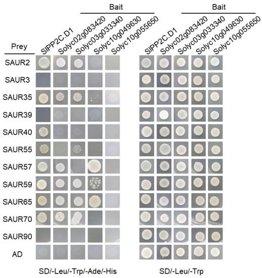 Additionally, the interaction between other SlPP2C.Ds and SlSAURs were also investigated. The results showed that SlSAUR2, SlSAUR35, SlSAUR59, SlSAUR65, and SlSAUR70 interacted with Solyc02g083420 and Solyc03g033340. In addition, Solyc02g083420 also interacted with SlSAUR57, while Solyc03g033340 was also associated with SlSAUR55. However, SlSAUR3, SlSAUR39, and SlSAUR90 did not interact with any SlPP2C.D proteins. Solyc10g049630 only interacted with three SlSAUR members: SlSAUR57, SlSAUR59, and SlSAUR65. For Solyc10g055650, no interaction was detected with any SlSAUR members (Figure 6).