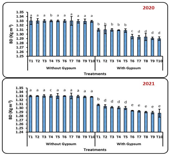 Combined effects of gypsum and bio-priming with PGPR and different levels of chitosan (0, 25, 50, 75, and 100 mg L−1), on soil physical characteristics at 120 days from sowing during 2020 and 2021 seasons. BD: bulk density; T1–T10: as shown in Table 3. According to the Duncan’s test, means denoted by various letters show significant differences between treatments (p ≤ 0.05).