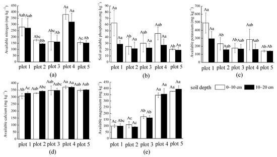 Soil available nitrogen (a), available phosphorus (b), available potassium (c), available calcium (d), available magnesium (e) of Z. planispinum plantations with different planting combinations. Plot 1, Z. planispinum + P. salicina; plot 2, Z. planispinum + S. tonkinensis; plot 3, Z. planispinum + A. hypogaea; plot 4, Z. planispinum + L. japonica; plot 5, Z. planispinum monoculture plantation. The vertical line on each bar is the error line, that is, the error range of the statistical results. The upper part is a positive error, and the lower part is a negative error. Lower case letters indicate significant differences between different plantation types of the same depth at p < 0.05; upper case letters indicate significant differences between different depths of the same plantation types at p < 0.05. One-way ANOVA was used to calculate the differences, p = 0.05, n = 15.