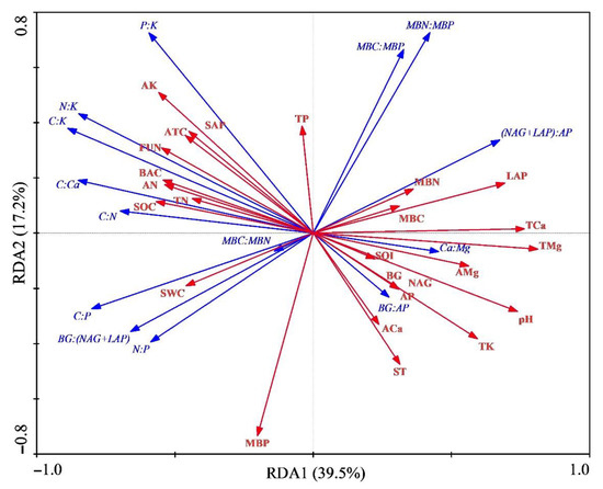 After taking the minimum dataset to filter the factor ranking, more than 20% of information was lost. It also caused the contribution of individual factors to be reduced again due to secondary dimensionality reduction. Therefore, we tried to select all indicators for RDA. The 24 soil quality factors and SQI, totaling 25 indicators involved in the PCA, were subjected to RDA as environmental variables. The final amount of variability explained by environmental factors on 14 stoichiometric ratios was obtained. As shown in Figure 3, the explanation rate of axis1 and axis2 were 39.50% and 17.20%, respectively, with a cumulative explanation rate of 56.7%, indicating that axis1 and axis2 could explain more than half of the information. The red and blue arrows in the figure represent soil quality indicators (explanatory variables) and soil stoichiometry (response variables), respectively. A longer length of arrows indicates a greater effect of the explanatory variables. A longer projection of a dashed arrow line on the solid arrow line indicates a greater effect on the soil stoichiometric ratio.
