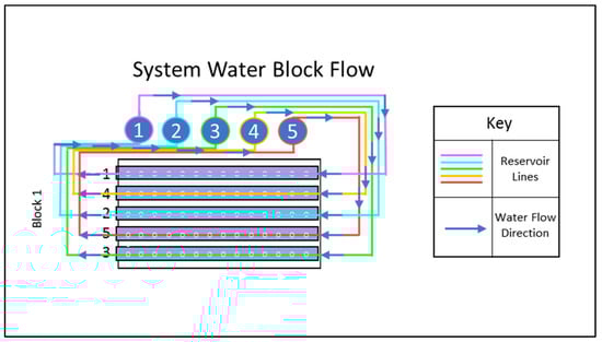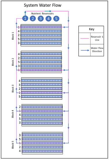 The experiment was organized as a randomized complete block design. There were five four-meter NFT channels (FarmTek, South Windsor, CT, USA) which held 15 plants each that were supplied with a solution from one of four 60-gallon (ca. 227.1 L) treatments (Figure 2 and Figure 3). There were three replications over time for trials with with iron supplementation and only one replication for trial without iron supplementation. Measurements were conducted on the middle eight plants in each channel (n = 160). Four treatments consisted of aquaculture effluent exchanged at one of the pre-determined HRT intervals of four, eight, twelve, or sixteen days. HRT Intervals were selected based on prior hydroponic experiments conducted on the system that showed solutions should be recycled after fourteen days to avoid nutrient depletion (data not shown). During the iron supplementation trial, a rate of 2.5 ppm chelated iron was added into aquaculture effluent. Rate of iron was supplemented was based on industry hydroponic lettuce formulas as well as from Cornell University’s lettuce literature guide after previous experiments revealed it was necessary [17].