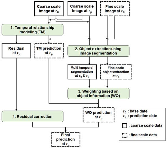 The WO prediction obtained in step 3 may contain smoothed or blurred phenomena through the weighted combination procedure. Thus, improvement in the WO prediction is required to mitigate the blurring effects. In addition, there remain residuals after the regression modeling in step 1. The residuals indicate the components that cannot be accounted for by independent variables. In the first step, the FTCS imagery at is used as the independent variable to account for the spectral variability of the FTCS imagery at . As a result, the residuals may contain temporal variation not modeled with regression. Thus, the residual correction can provide supplementary information, thereby improving the quality of the WO prediction.