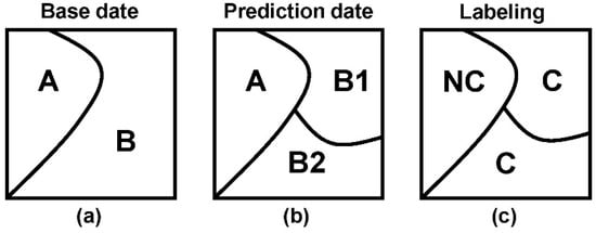 Illustration of object-based change detection through multi-temporal segmentation: (a) Two objects, A and B, at the base date; (b) three objects, A, B1, and B2, at the prediction date, where object B at the base date is sub-divided into two objects, B1 and B2; (c) labeling of the changed and non-changed objects, where NC and C indicate the non-changed and changed objects, respectively.