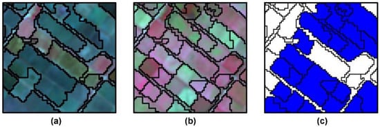 Illustration of multi-temporal segmentation results in the sub-area of Site 2. All color composite images are displayed with NIR-red-green as RGB: (a) Object boundaries superimposed on Sentinel-2 imagery at the base date (2 June 2018); (b) object boundaries superimposed on Sentinel-2 imagery at the prediction date (10 October 2018); and (c) changed objects highlighted in blue, where black polygons denote the objects boundaries in both (a,b).