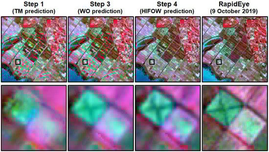 Figure 5 represents the interim results with the actual RapidEye imagery at Site 2, where one sub-area is also zoomed in for visual comparison. The TM prediction failed to produce spectral patterns consistent with the actual RapidEye imagery in several sub-areas. This spectral distortion is mainly due to the temporal variability of spectral reflectance between and . As the June imagery was used as the independent variable in the regression modeling of step 1, such a temporal variability could not be well captured in the TM prediction. Meanwhile, the spectral distortion decreased by applying steps 3 and 4.