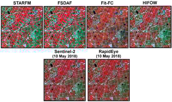 Prediction results of different STIF models with Sentinel-2 and RapidEye images at the prediction date (10 May 2018) at Site 1. All color composite images are displayed with NIR-red-green as RGB.
