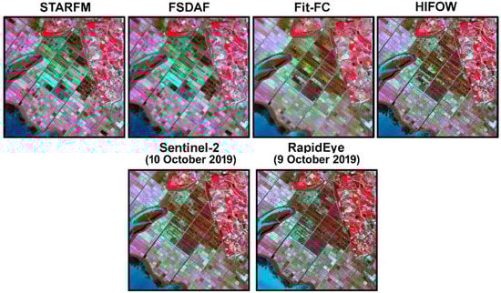 Prediction results of different STIF models with Sentinel-2 (10 October. 2019) and RapidEye images (9 October. 2019) at the prediction date at Site 2. All color composite images are displayed with NIR-red-green as RGB.