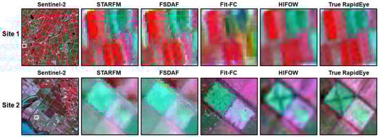 The differences between the prediction results of the four STIF models are more clearly highlighted in some zoomed-in sub-areas (Figure 8). The results of STARFM and FSDAF at Site 1 contained spatially degraded boundaries and spectral distortions. In the FSDAF prediction, some artifacts were more pronounced than STARFM. The pixel-based classification contained in FSDAF may result in such artifacts. Severe spectral distortion was observed in the Fit-FC prediction (e.g., dark blue color patches in Figure 8). In contrast, blurred boundaries became more apparent, and the color and spatial details of the actual RapidEye image were well-represented in the HIFOW prediction.