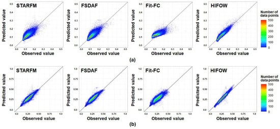 No apparent differences between the prediction results of HIFOW and the other two models were observed at Site 1 from the visual comparison. However, their differences are clearly shown at Site 2 (Figure 7). The prediction results of STARFM and FSDAF were very similar, with the greenish color (i.e., very low spectral reflectance in the NIR band) for grasslands grown in central unmanaged paddy fields. This result is mainly due to the strong effects of the RapidEye image at . As shown in Figure 3, relatively low spectral reflectance in the NIR band in June was observed in these fields where the land-cover type was barren in June. As the land-cover type was changed to grassland in October, STARFM and FSDAF could not depict the spectral pattern at . On the other hand, the prediction result of Fit-FC represented the temporal change in the reflectance of grassland well. However, the blurred boundaries of some cabbage fields in the northern and northeastern parts of the study area were observed in the Fit-FC prediction. Meanwhile, HIFOW produced the prediction results where the color was similar to the actual RapidEye image, except for some grassland fields with low reflectance in the NIR band.