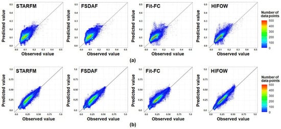 The predictive performance of HIFOW was compared with three existing STIF models, including the spatial and temporal adaptive reflectance fusion model (STARFM), flexible spatiotemporal data fusion (FSDAF), and regression model fitting, spatial filtering, and residual compensation (Fit-FC). The three existing STIF models were chosen based on the following reasons: (1) they utilize a single image pair as input data, as in HIFOW, (2) they include the weight determination or local filtering step based on the local neighborhood system, and (3) their source code is publicly available [,,]. For a fair comparison, the size of the local neighborhood or moving window, which is a parameter common to all three models, was set to 5, the same size applied to HIFOW. The number of neighboring pixels that are spectrally similar to the central pixel within the local neighborhood was set to 10 in consideration of the local neighborhood size. Moreover, the minimum number of land-cover classes required for FSDAF was set to 7, corresponding to the number of land-cover types in the two study sites.