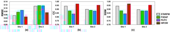 Figure 6 shows the prediction results of different STIF models at Site 1. The barren lands in the eastern part of the study site appeared brighter than the actual RapidEye imagery, whereas their spectral patterns were predicted to be darker by Fit-FC. Moreover, most spectral patterns of Fit-FC were spatially blurred and not consistent with the actual RapidEye imagery. Consequently, it is expected that Fit-FC would yield the worst RMSE and SSIM.
