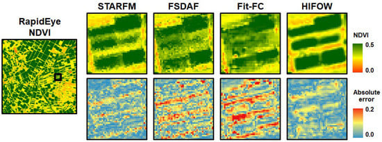 The normalized difference vegetation index (NDVI), one of the representative vegetation indices [,], was further predicted to illustrate the practicability of HIFOW. The comparison of NDVI prediction was conducted because the two study sites mainly contain vegetation areas, such as crop fields. The NDVI may be calculated from the predicted reflectance values of the red and NIR bands. Such a blend-then-index approach is inevitably affected by errors attached to the prediction of reflectance. Thus, an index-then-blend approach, where the NDVI values calculated from each sensor image are directly fed into the STIF model, is preferred to mitigate error propagation problems []. In this study, the index-then-blend approach was employed for the prediction of NDVI.